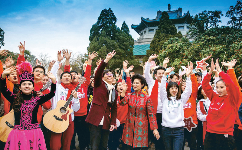 2018年岁末,千余名武汉大学师生登上樱园老斋舍,用快闪唱响《我和我的祖国》,表达当代年轻学子的爱国之情。 武汉大学 王志敏/摄