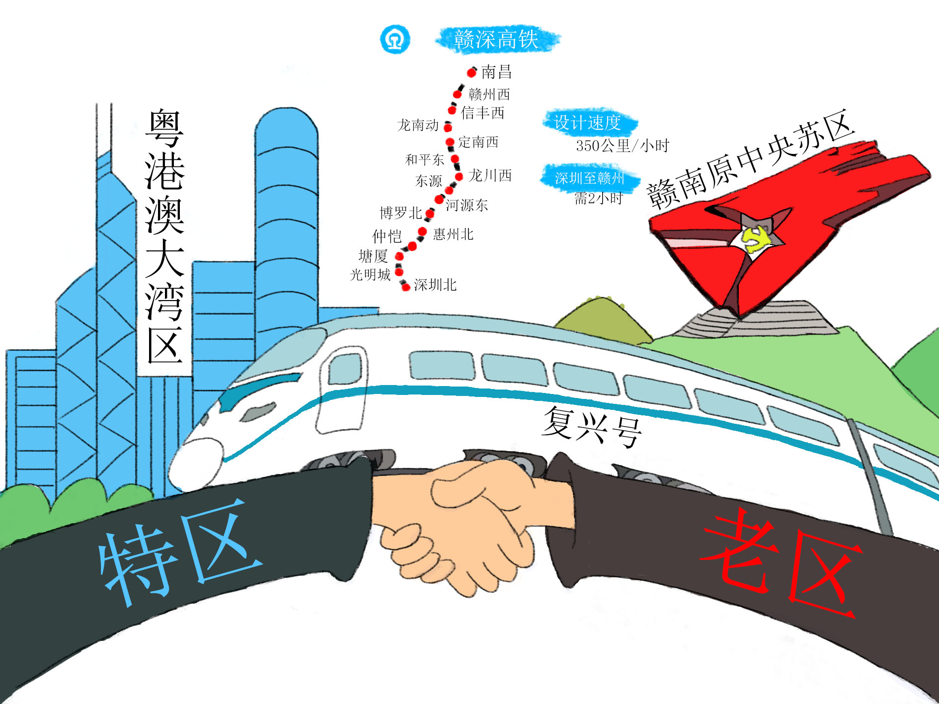 振兴发展赣南等原中央苏区,既是一项重大的经济任务,更是一项重大的政治任务。早在今年2月20日,国务院发布了《关于新时代支持革命老区振兴发展的意见》,进一步明确了支持革命老区振兴发展的主要目标,将支持革命老区振兴发展纳入国家重大区域战略和经济区、城市群、都市圈相关规划并放在突出重要位置,加强革命老区与中心城市、城市群合作,支持赣南等原中央苏区深度参与粤港澳大湾区建设,支持革命老区积极参与“一带一路”建设,以开放合作增强振兴发展活力。为了促进赣南等原中央苏区的振兴发展,圆革命老区人民的高铁梦,赣深高铁在河源市龙川县专门拐了一个弯,将彻底结束沿线和平、龙川、东源、河源等4个县市区不通快速铁路的历史,进一步完善革命老区的交通运输网络,加快与深圳特区等经济区、城市群、都市圈的互联互通,对服务老区人民的生活出行以及经济社会发展,具有十分重要的现实意义。