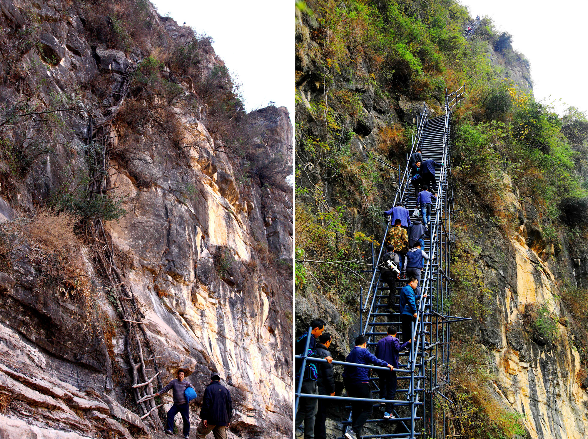 拼版照片:左图为2013年2月22日拍摄的四川省凉山彝族自治州昭觉县“悬崖村”阿土勒尔村的藤梯;右图为2016年11月29日,在四川省凉山彝族自治州昭觉县,人们沿着刚建好的钢梯登上“悬崖村”。新华社发(阿克鸠射 摄)