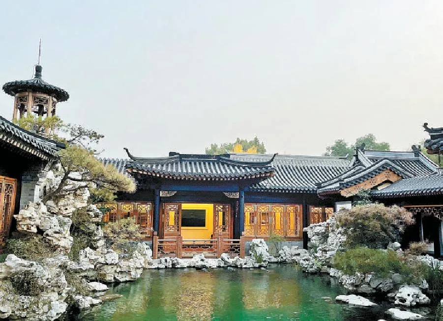 一泓池水,清澈如镜,廊、轩、亭、榭环绕四周,夹岸有叠石、绿植、繁花,明朗清雅。后楼为展厅,《天工开悟——夏航雕塑展》曾在这里展出。