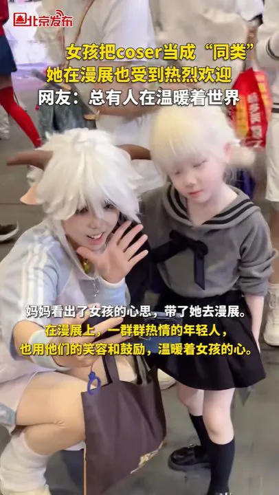 “妈妈,他们和我一样啊。”今年,在北京,一名患白化病的女孩在地铁站将coser当成了“同类”,妈妈看到后便带女儿去了漫展。漫展上,白头发不再是异类,因为coser们的头发五颜六色,白色的头发更是随处可见。一群热情的年轻人用他们的笑容和鼓励,温暖着小女孩的心,让她感受到了那种被人接纳、被人喜欢的感觉。