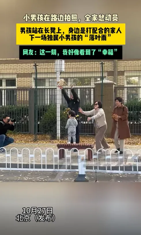 今年10月,一个小男孩在路边拍照,四个家人围在旁边“打配合”。小男孩站在长凳上,爸爸负责拍照,妈妈和两位长辈扬起落在地上的叶子,为小男孩下一场专属的“落叶雨”。这一刻,“幸福”的样子具象化了。