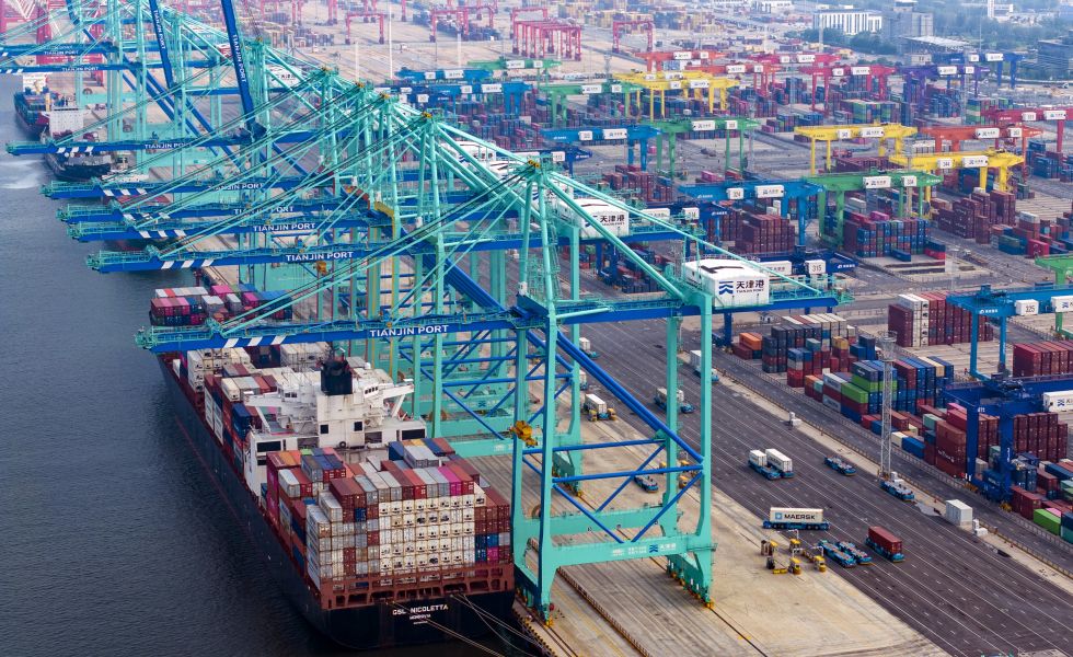 2024年 7月3日,一艘集装箱货轮停靠在天津港“智慧零碳”码头(无人机照片)。新华社记者 赵子硕 摄