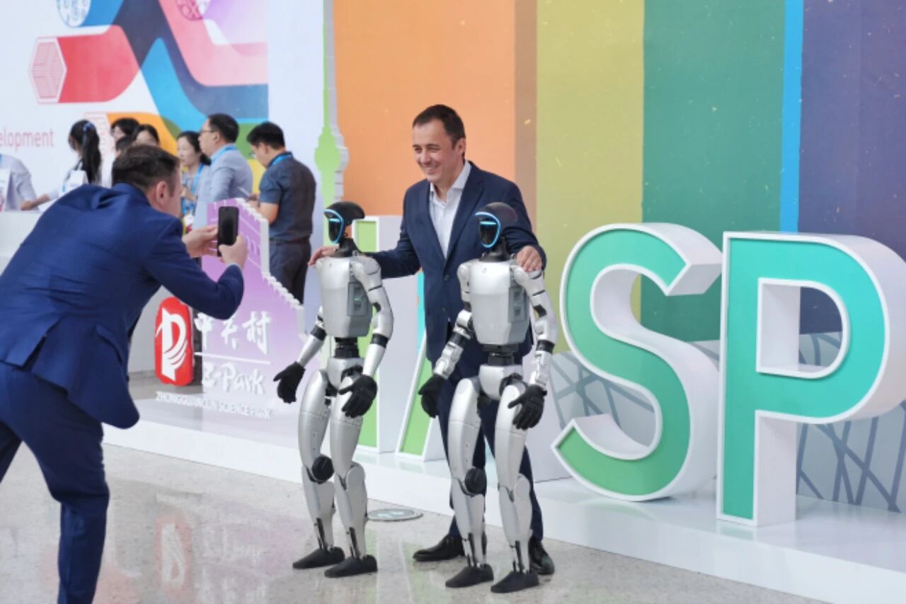 2025年9月17日,国际科技园及创新区域协会(IASP)2025年世界大会在北京国家会议中心开幕。图为外籍嘉宾在大会现场同机器人合影。中新社记者 张祥毅 摄