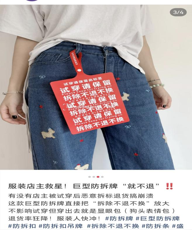 千龙网讯 近来,电商平台上的“巨型吊牌”成了热议话题。有些商家把吊牌做得比商品本身还大,上面印满密密麻麻的退货条款,甚至直接标注“拆封即不支持退货”。这看起来有些荒诞的操作,实则是商家在恶意退货浪潮里的无奈自保。