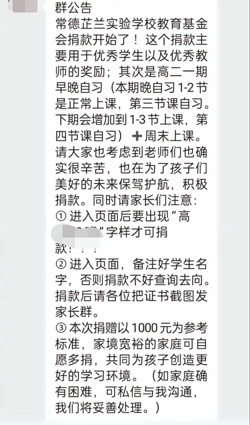 近日,有湖南常德网友反映,常德芷兰实验学校某家长群内发布公告,要求家长向校教育基金会捐款,捐款主要用于奖励优秀学生以及优秀教师,其次为老师上自习和周末上课的奖励费用,参考标准为1000元,家庭宽裕的家庭可自愿多捐。奔流新闻记者以家长身份从常德芷兰实验学校了解到,学校未设定捐款标准,群公告为家委会自行发布。