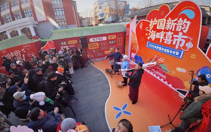 ▲1月24日,伴随着一声响亮厚重的锣声和韵味十足的传统叫卖声,“护国新韵 海畔喜‘市’”护国寺市集正式开市。新京报记者 薛珺 摄