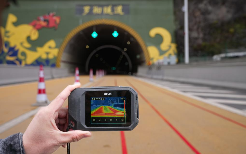 ▲工作人员在用热成像仪测试乐西高速罗彻隧道口使用环路热管融雪系统效果。图/新华社